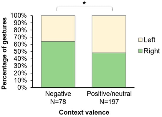Percentage of gestures produced with the left or right hand, depending on the emotional valence of context. “Negative” valence corresponds to aggression and submission contexts, and “positive/neutral” corresponds to affiliation, grooming, play, and sexual contexts. GLMM Binomial: *: p < 0.05.