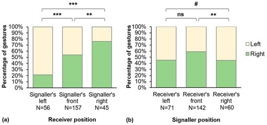 (a) Percentage of gestures produced with the left or right hand, depending on the receiver position in the signaler’s visual field; (b) Percentage of gestures produced with the left or right hand, depending on the signaler position in the receiver’s visual field. GLMM Binomial: ns: non-significant difference; #: 0.05 < p < 0.1; **: p < 0.01; ***: p < 0.001.