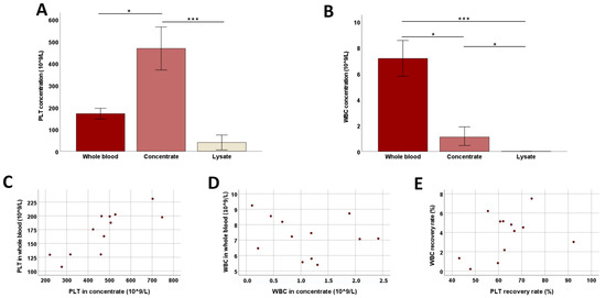 Platelet and white blood cell counts during blood processing. Median platelet (PLT; (A)) and white blood cell (WBC; (B)) counts at the different stages of blood processing (whole blood, concentrate, and lysate before filtration) are presented; error bars display the 95% confidence intervals. Friedman tests for group comparisons and subsequent post hoc tests were performed; the asterisks describe the significant differences between groups (* corresponds to p < 0.05; *** corresponds to p < 0.001). The dot plots show PLT (C) and WBC (D) counts in whole blood vs. concentrate and WBC vs. PLT recovery rates (E); the correlation shown in (C) was significant (p < 0.001 and r = 0.820, based on Spearman’s rank correlation). All data were obtained from n = 12 dogs.
