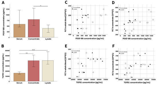 Growth factor concentrations during blood processing. Median platelet-derived growth factor (PDGF-BB; (A)) and transforming growth factor-β1 (TGFB1; (B)) concentrations at the different stages of blood processing (whole blood, concentrate, and lysate before filtration; samples had been stored at −80 °C before analysis) are presented; error bars display the 95% confidence intervals. Friedman tests for group comparisons and subsequent post hoc tests were performed; the asterisks indicate the significant differences between the corresponding groups (* corresponds to p < 0.05; ** corresponds to p < 0.01; *** corresponds to p < 0.001). The dot plots show platelet (PLT) concentrations in whole blood (C,E) or concentrate (D,F) vs. PDGF-BB (C,D) or TGFB1 (E,F) concentrations in concentrate (circles) and lysate (triangles); the correlations shown in (C) (p < 0.01 and r = 0.729 for concentrate; p < 0.05 and r = 0.641 for lysate), (D) (p < 0.01 and r = 0.804 for concentrate; p < 0.01 and r = 0.748 for lysate), (E) (p < 0.05 and r = 0.676 for lysate), and (F) (p < 0.05 and r = 0.671 for lysate) were significant based on Spearman’s rank correlation. All data were obtained from n = 12 dogs.
