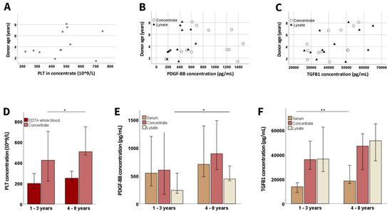 Age-related differences in platelet and growth factor concentrations. The dot plots show donor age vs. platelet (PLT; (A)) concentration in concentrate, as well as platelet-derived growth factor (PDGF-BB; (B)) and transforming growth factor (TGFB1; (C)) concentrations in concentrate (circles) and lysate (triangles); the correlation shown in (B) was significant for lysate (p < 0.001 and r = 0.820, based on Spearman’s rank correlation). The bar plots show the median PLT (D), PDGF-BB (E), and TGFB1 (F) concentrations in EDTA whole blood or serum samples drawn directly from the donor dogs, as well as in samples from different processing stages, obtained from younger and older donors; data from the younger vs. the older animals were compared using Mann–Whitney U tests; the asterisks indicate the significant differences between the corresponding groups (* corresponds to p < 0.05; ** corresponds to p < 0.01). Data were obtained from n = 7 younger and n = 5 older dogs.
