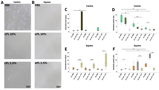 Confirming the findings described above, the metabolic activity of canine MSC was decreased in cPL 10% medium as compared to FBS medium (p < 0.05 in P5), and even more decreased in cPL 2.5% medium (p < 0.05 in P3, p < 0.01 in P4). Furthermore, the metabolic activity decreased continuously from P3 to P5 in FBS and cPL 10% media (p < 0.05) (Figure 4D,F).