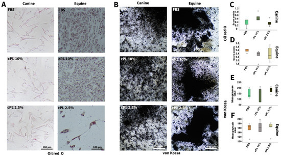 Adipogenic and osteogenic differentiation. Representative bright-field photomicrographs show canine (left column) and equine (right column) mesenchymal stromal cells (MSC) after adipogenic (A) and osteogenic (B) differentiation, with Oil Red O and von Kossa staining, respectively. Boxplots display the corresponding data obtained by scoring adipogenic differentiation of canine (C) and equine (D) MSC and image analysis using Fiji ImageJ after osteogenic differentiation of canine (E) and equine (F) MSC. MSC were cultured in the media indicated before differentiation was induced (FBS: fetal bovine serum; cPL: canine platelet lysate; ePL: equine platelet lysate). Data were obtained using MSC from the same n = 5 donor dogs or horses in each group.