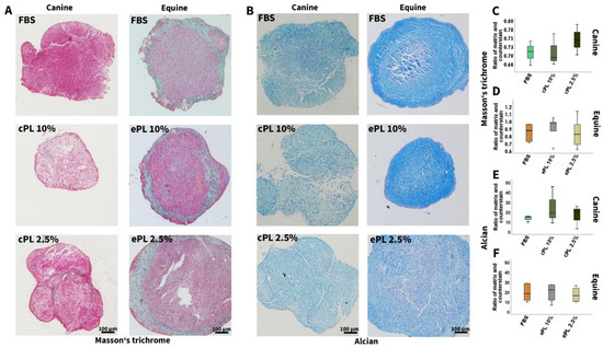 Chondrogenic differentiation. Representative bright-field photomicrographs show canine (left column) and equine (right column) mesenchymal stromal cells (MSC) after chondrogenic differentiation and Masson’s trichrome (A) and Alcian (B) staining. Boxplots display the corresponding data obtained by image analysis using Fiji ImageJ (C–F). MSC were cultured in the media indicated before differentiation was induced (FBS: fetal bovine serum; cPL: canine platelet lysate; ePL: equine platelet lysate). Data were obtained using MSC from the same n = 5 donor dogs or horses in each group.