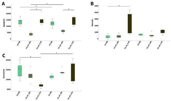 Apoptosis, necrosis, and senescence in canine cells. Boxplots display (A) apoptosis levels of canine mesenchymal stromal cells (MSC), measured by a luminescence-based Annexin V assay in passage 3 (P3) and 5 (P5) at day 5; (B) necrosis levels of canine MSC, measured using a cell-impermeant and pro-fluorescent DNA dye in passage 3 (P3) and 5 (P5) at day 5; (C) senescence levels of canine MSC in passage 3 (P3) and 5 (P5) at day 5, measured based on SA-β-galactosidase activity. Friedman tests for group comparisons and subsequent post hoc tests were performed; the asterisks indicate the significant differences between the corresponding groups (* corresponds to p < 0.05). Data were obtained using MSC from the same n = 5 donor dogs in each group.