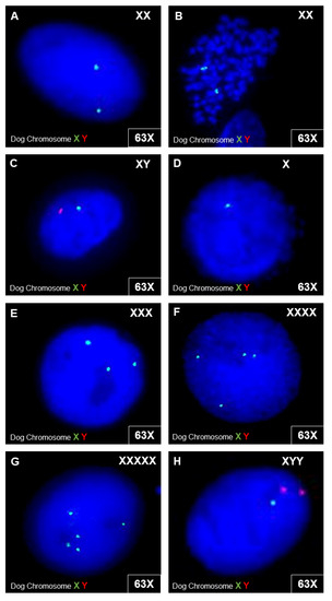 Cytogenetic analyses in canine cells. FISH analyses were performed with dog chromosome XY FISH probes (centromeric alpha satellite DNA probe; chromosome X—spectrum green; chromosome Y—spectrum red) on interphase cells (A,C–F) and one metaphase cell (B). Exemplary images show the detected signal constellations. In (A–C), microscopic images of interphase cells and metaphase cells with a normal gonosomal karyotype are shown. In (D–H), examples of interphase cells with different signal patterns are shown, with one signal for X (D), three signals for X (E), four signals for X (F), and five signals for X (G). For some interphase cells, a combination of signals from one X-chromosome and two Y-chromosomes were detected (H).