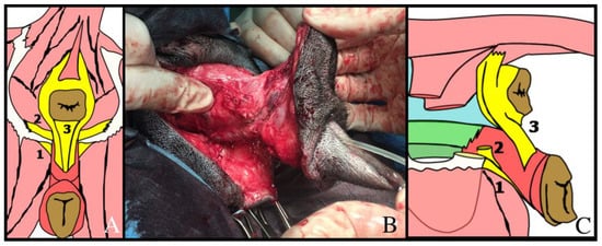 Caudal (A) and lateral (C) schematic presentation of the perineal muscles: (1) ischiocavernosus muscle; (2) ischiourethralis muscle; (3) vestibular muscle. (B) Intraoperative image of the lateral view of vulva and vestibule after the resection of the ischiocavernosus and ischiourethralis muscles.