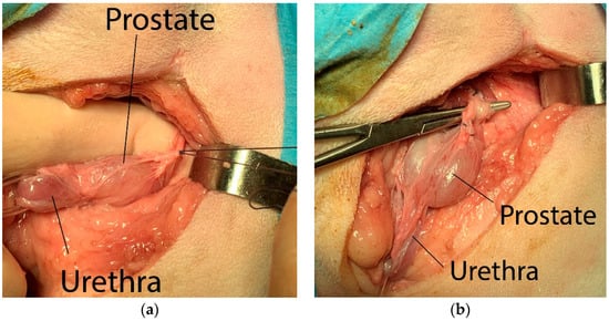 Prostatectomy is a surgical procedure that involves the removal of the prostate, either partially (partial prostatectomy) or completely (total prostatectomy). Total prostatectomy is carried out mainly in early detected non-metastatic prostatic tumors, but it can also be used in the case of severe trauma, vascular disorders due to prostate dislocation, recurrent and/or unresponsive abscesses, or cystic formations. In the last two situations, however, other options are often described, such as partial prostatectomy, omentalization, marsupialization if needed, or the placement of a drain [1,2,3]. Total prostatectomy is considered technically difficult to perform, carrying with it many complications and unwanted side effects [4,5,6,7], even if, in the authors’ experience, complications have not been so frequently encountered [8]. The literature reports a high probability of urinary incontinence following total prostatectomy [9]. According to some authors, this complication occurs in over 90% of subjects [10], while according to others the percentage varies from 33% to 100% of treated cases [1,11]. For these reasons, it is usually preferred to treat prostate diseases through a conservative approach, although in some cases it may be necessary to remove the gland. The standard total prostatectomy provides a caudal celiotomy. Given the particular localization of the gland, a pubic symphysiotomy [12] or pubic and ischial osteotomies may be required in order to improve access to the prostate gland and the pelvic urethra [12,13].