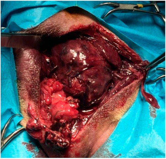 Four dogs survived after the discharge from the hospital, while one dog (Table 1; case 1) died at the end of surgery due to unresponsive cardiorespiratory failure (his conditions were already critical at the time of admission to the hospital) and one dog (Table 1; case 3) was euthanized after a week for progressive clinical and laboratory worsening, above all renal values. Among the rest of the dogs, one dog (Table 1; case 6) died after seven months for local tumour recurrence; the remaining three dogs (Table 1; cases 2, 4, 5) were monitored with telephone follow-ups for six months from the discharge.