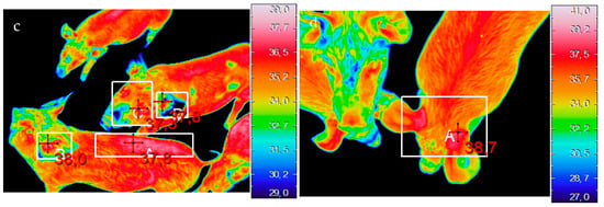 Examples of thermal images of the dorsal (a), ocular (b), front ear (c) and back ear (d) regions. The white rectangles indicate the areas in which the maximum temperatures were recorded.