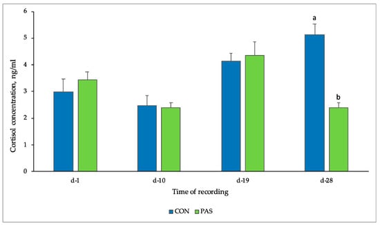 Cortisol concentrations (mean ± SE) found in saliva samples of two experimental groups. CON: control animals receiving only the basal diet without natural extract supplementation; PAS: animals receiving the control diet supplemented with Passiflora incarnata extract (1 kg/t); a,b Means within a row with different letters are significantly different at p < 0.05.