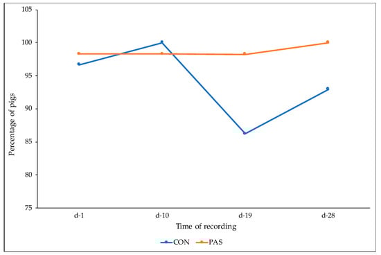 All pens in the CON group and three pens in the PAS group reported at least one pig assessed as score 2 for tail biting during the experimental period. Those pens were provided with additional enrichment material. Tail lesions were not affected by dietary treatment (p = 0.973), and a time effect was detected (p < 0.001) (Figure 4).