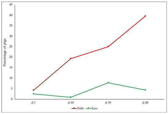 Percentage of pigs with tail and ear lesions at different times of recording.