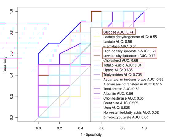 The serum physiological and biochemical parameters were detected by a Cobas C 311 analyzer (Roche, Mannheim, Germany, 68305), and data collection was accomplished by the built-in software (software version 01–09) as described []. The parameters of low-density lipoprotein (LDL) (Roche, Germany, 07005717190), glucose (Roche, Germany, 04404483190), lactate (Roche, Germany, 03183700190), lactate dehydrogenase (LDH) (Roche, Germany, 03004732122), α-amylase (Roche, Germany, 03183742122), total bile acid (TBA) (Roche, Germany, 03333825190), cholesterol (Roche, Germany, 03039773190), lipase (Roche, Germany, 03029590322), total protein (Roche, Germany, 03183734190), albumin (Roche, Germany, 03183688122), alanine aminotransferase (ALT) (Roche, Germany, 04467388190), high-density lipoprotein (HDL) (Roche, Germany, 07528566190), aspartate aminotransferase (AST) (Roche, Germany, 20764949322), cholinesterase (Roche, Germany, 04498631190), triglycerides (TG) (Roche, Germany, 20767107322), creatinine (Roche, Germany, 04810716190), and urea (Roche, Germany, 04460715190) were measured and analyzed. Non-esterified fatty acids (NEFA) and β-hydroxybutyrate (BHB) were assayed using a non-esterified fatty acids assay kit (Jiancheng, China, A042-1-1) and β-Hydroxybutyrate assay kit (Jiancheng, China, E030-1-1). Receiver operating characteristic (ROC) curves were performed using the OmicStudio tools at https://www.omicstudio.cn/tool/58, accessed on 31 October 2021.