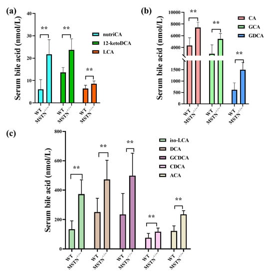 Targeted metabolomics analysis identifies the alteration of bile acids in serum of MSTN+/− and WT cattle. (a–c) Differentially expressed bile acid species were identified. ** p < 0.01. WT, wild type; MSTN+/−, MSTN heterozygous deletion. Abbreviations: nutriCA, nutritional cholic acid; 12-ketoDCA, 12-ketodeoxycholic acid; CA, cholic acid; GCA, glycol-cholic acid; GDCA, glycodeoxycholic acid; iso-LCA, isolithocholic acid; DCA, deoxycholic acid; GCDCA, glycol-chenodeoxycholic acid; LCA, lithocholic acid; CDCA, chenodeoxycholic acid; ACA, acetylcholic acid.