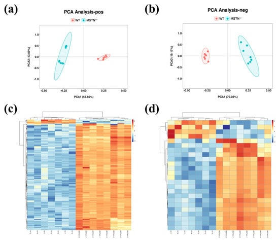 Untargeted metabolomics analysis of liver in MSTN+/− and WT cattle. Principal component analysis (PCA) of metabolic data in positive (a) and negative (b) ion mode. Heat map of differential metabolites in positive (c) and negative (d) ion mode. WT, wild type; MSTN+/−, MSTN heterozygous deletion.