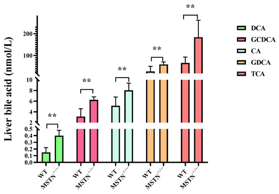 Targeted metabolomics analysis identifies the alteration of bile acid in the liver of MSTN+/− and WT cattle. Differentially expressed bile acid species were identified in the liver. ** p < 0.01. WT, wild type; MSTN+/−, MSTN heterozygous deletion. Abbreviations: DCA, deoxycholic acid; GCDCA, glycol-chenodeoxycholic acid; CA, cholic acid; GDCA, glycodeoxycholic acid; TCA, taurocholic acid.