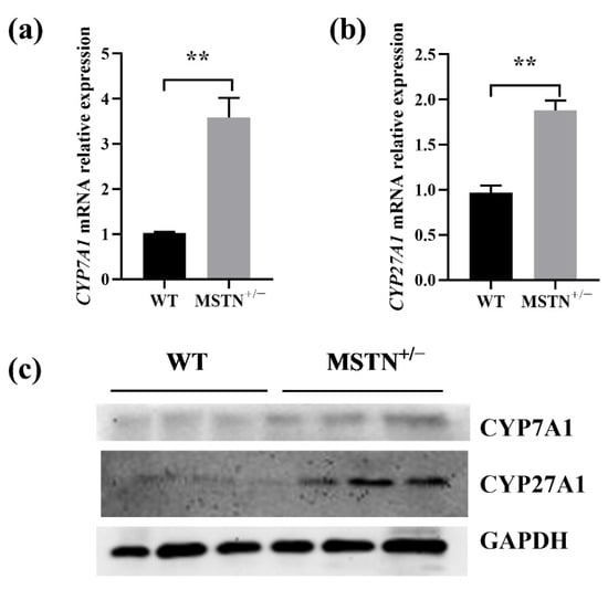 Since the liver is the major site of bile acid synthesis, we asked whether the MSTN+/− cattle regulated bile acid synthesis. Two genes encoding the key enzymes for the classical and alternative pathway of bile acid synthesis were upregulated in the MSTN+/− cattle (Figure 5). As in Figure 5a,b, the mRNA levels of cholesterol 7 alpha-hydroxylase (CYP7A1) and sterol 27-hydroxylase (CYP27A1) in the MSTN+/− cattle were significantly increased. Consistent with the mRNA results, the protein levels of CYP7A1 and CYP27A1 were significantly upregulated in the MSTN+/− cattle compared with the WT cattle (Figure 5c). These results suggest that the MSTN+/− cattle lead to increased content of hepatic bile acids by upregulating the expression of genes associated with bile acid synthesis.