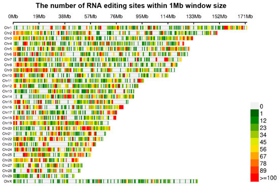 RNA editing refers to a newly discovered mechanism that alters the RNA sequence itself without altering its genomic DNA (gDNA) through nucleotide deletion, insertion, and substitution [1]. These types of modifications may occur within the coding or noncoding regions, which result in transcriptome plasticity and diversity along with changing amino acid, impacting alternative splicing (AS), affecting RNA stability, and modulating the nuclear retention of RNAs [2,3]. There are two major RNA editing types in mammals, including adenosine-to-inosine (A-to-I) editing (most frequently seen in vertebrates) under the catalysis of adenosine deaminase acting on RNA (ADAR) proteins [4] and C-to-U RNA editing under the catalysis of cytidine deaminases belonging to the apolipoprotein B-editing catalytic polypeptide-like (APOBEC) family [5]. The advancement of computational methods has enabled elucidating many RNA editing sites in human and mouse [6]. More recently, a few studies have focused on the function of RNA editing in farm animals, such as cattle [7,8], pig [9,10], sheep [11], goat [12], and chicken [13,14].