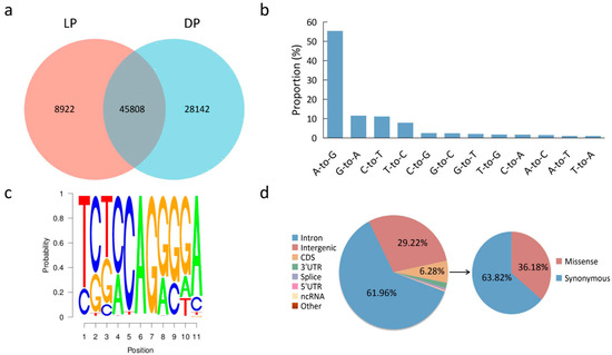 Signatures of the editome in the mammary gland. (a) Number of shared editing sites between LP and DP. (b) Distribution of RNA editing types. (c) A-to-G RNA editing motif. (d) Distribution of the identified RNA editing sites across different genomic locations.