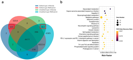 The influence of RNA editing sites on miRNA regulation. (a) Overall statistics of the RNA editing sites that altered miRNA binding capacity. The altered interactions are marked with red boxes. (b) KEGG enrichment analysis of genes with modified miRNA binding sites. Rich Factor is the ratio of differentially edited gene numbers annotated in this pathway term to all gene numbers annotated in this pathway term.