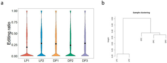Features of RNA editing levels within and between groups. (a) The violin plot of editing levels across samples. (b) Hierarchical clustering of RNA editing levels across five samples.