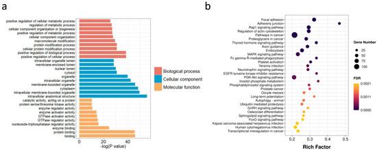 Surprisingly, the number of RNA editing sites was obviously different among diverse samples, but the average editing level of detected sites was similar (mean level, 0.19–0.28) (Figure 4a). On the basis of hierarchical clustering, fewer heterogeneities in editing levels were detected in intra-group than in inter-group (Figure 4b), indicating that the transcriptome-wide RNA editing level could be used to characterize the physiological changes in the mammary gland. We identified differentially edited sites between the LP and DP by using Tukey’s Honest Significant Difference method. A total of 14,159 sites in 3238 genes was differentially edited between the LP and DP (p < 0.05) (Table S6). The GO analysis showed that genes with differential editing levels were remarkably enriched into 1256 terms (Table S7). In the biological process (BP) category, the most significantly enriched terms were positive regulation of cellular process, positive regulation of biological process, and cellular protein modification process. In the molecular function (MF) category, the most significantly enriched terms were protein binding, enzyme binding, and nucleoside-triphosphatase regulator activity. In the cellular component (CC) category, intracellular anatomical structure, intracellular membrane-bounded organelle, and cytoplasm were the most significantly enriched terms (Figure 5a). As suggested by the KEGG analysis, genes with differential editing levels were enriched in 124 pathways, including focal adhesion pathway, MAPK signaling pathway, PI3K-Akt signaling pathway, GnRH signaling pathway, and FoxO signaling pathway (Figure 5b; Table S8).