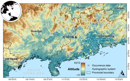 Crocodile lizards (Shinisaurus crocodilurus) are habitat specialists confined to densely vegetated rocky streams in cool forests found only in Guangxi and Guangdong provinces of southern China and Bắc Giang and Quảng Ninh provinces in northern Vietnam [48,49]. However, the historical distribution of the crocodile lizard was as far north as Jianghua County in Hunan Province and as far south as the Tropic of Cancer. Due to habitat destruction and subsequent fragmentation, the distribution range of this species is gradually shrinking [48]. We obtained a total of 1048 occurrences of the species from the following three sources: (a) fieldwork (830 records); (b) Global Biodiversity Information Facility records (GBIF, http://www.gbif.org/, accessed on 1 May 2021); and (c) published literature. We used Google Earth (http://ditu.google.cn/, accessed on 15 August 2021) to retrieve coordinates for occurrences that were missing geographical coordinates and discarded erroneous or duplicate records. To avoid spatial auto-correlation, we kept only one distribution point within each raster (1 km × 1 km). This left us with 985 occurrence records to be used in the modeling (Figure 1).