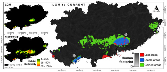 Potential distribution range of crocodile lizards under LGM and current climate scenario. a: The stable area of crocodile lizards distribution in China from LGM to current; b: The stable area of crocodile lizards distribution in Vietnam from LGM to current.