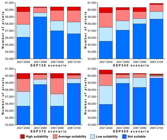 With increasing radiative forcing, the suitable habitat for crocodile lizards will decrease. Therefore, under the climate change scenarios SSP126, SSP245, SSP370, and SSP585, the current habitats occupied by crocodile lizards are expected to decrease from 2021 to 2100 (Figure 4 and Figure 5). In the most optimistic climate scenario (SSP126), suitable habitat is expected to decrease to 2.34% from 2041 to 2060, and it would increase to 6.54% from 2081 to 2100. In this scenario, the medium habitat remained at about 2.50%, while the extreme value for high-quality habitat was 0.11%. Under climate scenarios with moderate radiative forcing (SSP245 and SSP370), high-quality habitat fluctuates periodically. Under SSP245, suitable habitat increased to 1.25% from 2021 to 2040, increased to 0.98% from 2061 to 2080, decreased to 0.61% from 2041 to 2060, and decreased to 0.67%) from 2081 to 2100. Under SSP370, suitable habitat increased to 1.19% from 2021 to 2040, increased to 1.17% from 2061 to 2080, decreased to 0.26% from 2041 to 2060, and decreased to 0.43% from 2081 to 2100. A future decrease in suitable habitat for crocodile lizards was predicted under the highest radiative forcing scenario (SSP585), which would occur if temperatures continue to rise. Therefore, the average suitable habitat for S. crocodilurus would decrease more from 2021 to 2100 than the value predicted under the other three climate scenarios. In particular, high-quality habitat is expected to decrease to 0.95% from 2021 to 2040, 0.29% from 2041 to 2060 and 0.16% from 2061 to 2080. The proportion of high-quality habitats is expected to rebound briefly from 2081 to 2100, rising to 0.24% (Figure 5).