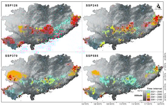 Global climate change is affecting the distribution of ectotherms and may be the cause of a number of conservation issues, such as the dramatic displacement of suitable climatic space for species, leading to a significant reduction in habitable sites and threatening the existence of many of them [101]. The results of the ENMs and MigClim model were consistent, with suitable habitats for crocodile lizards showing an overall trend of decreasing with increasing temperature. Importantly, under the highest radiative forcing scenario (SSP585), all habitat is completely lost between 2081 and 2100 (reduction rate 100%). Huang et al. [102] showed that Dayao Mountain may be an ancient habitat refuge and that Guangxi and Luokeng might have been the source populations for an initial population expansion. Both the LGM and the current findings highlight the importance of Luokeng for crocodile lizards, and that it may also have been an important historical refuge for crocodile lizards. The results of warm and particularly dry conditions may include unsustainable declines in replenishment, particularly in parts of a species range where heat/humidity conditions have become marginal [22].