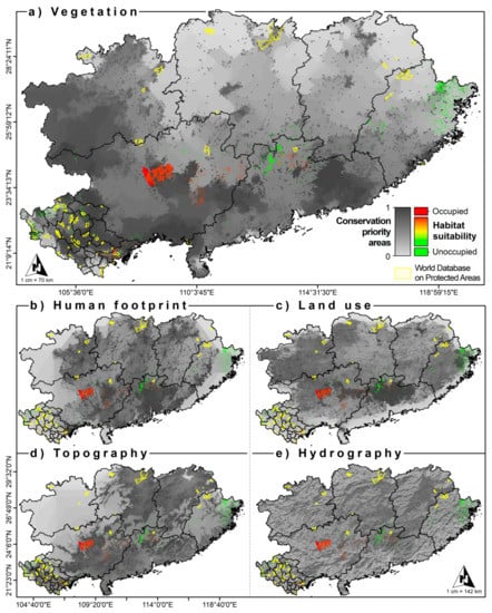 Conservation status for the S. crocodilurus species considering the World Database on Protected Areas (WDPAs). (a): priority conservation areas under vegetation; (b): priority conservation areas under human footprint; (c): priority conservation areas under land use; (d): priority conservation areas under topography; (e): priority conservation areas under hydrography.