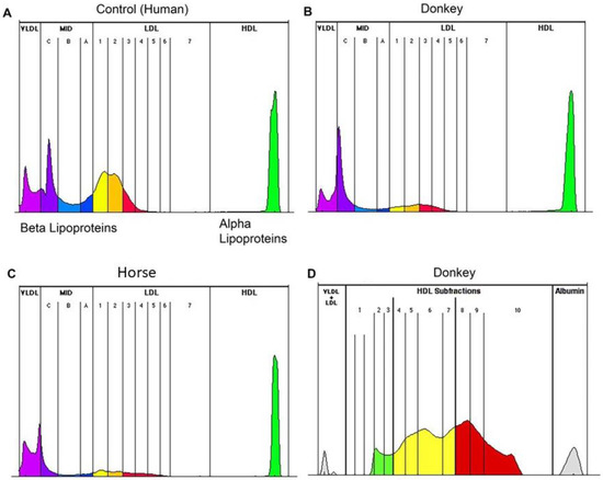 Lipoprotein patterns can differ across different species, various breeds, and also between healthy and diseased states [10]. Thus, reagents developed for the quantification of human HDL and LDL are frequently proven inaccurate in veterinary species [11,12]. Several studies evaluating HDL and LDL in equids have not included or cited validation of the method for use in equids [13,14]. The Lipoprint® assay uses high-resolution polyacrylamide gel electrophoresis to rapidly assess human LDL and HDL at the subfraction level. The method relies only on the physical characteristics of the lipoproteins, and uses no potentially species-specific reagents such as antibodies or precipitation methods. In this study, we evaluated this method for use in equids. We compared the electrophoretic particle size distribution between apparently healthy donkeys and large-breed horses. Defining these lipoprotein patterns to the subfraction level in apparently healthy equids will provide baseline information, so that future work may assess this assay as a diagnostic tool for the identification and/or prognostication of dyslipidemias in equids.