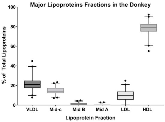 Summative data of the Lipoprint® fractionation for all donkeys, displaying the median (bar) third and first quartiles (box), and 2.5–97.5% (whiskers) outliers are shown as individual points. The percent of total lipoproteins is generated from the area under the curves from the densitometry plots.