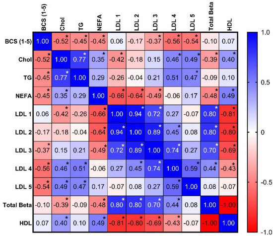 Correlation matrix comparing BCS, serum lipids, and lipoprotein classes/subfractions. Data are presented as the Spearman r. Asterisks indicate p < 0.05.