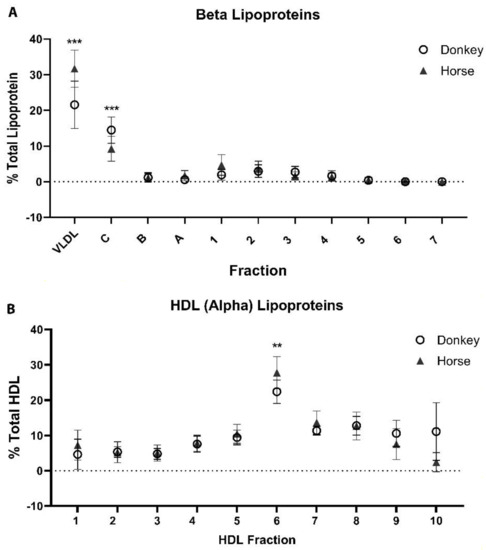Data were analyzed using Prism Graphpad software V9. (San Diego, CA, USA) Descriptive data (mean, SD, range) were generated for each fraction and subfraction. Normality was evaluated using the Shapiro–Wilk test. The individual lipoprotein fractions were compared between donkeys and horses using the Mann–Whitney test. A p < 0.05 was considered significant. Correlational analysis (Spearman rank) was performed to look for relationships between triglycerides and the beta lipoproteins.