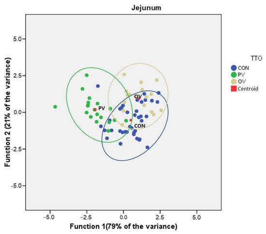 Discriminant functions plot for jejunum, ileum and colon, where the quantifications for biomarkers (CAL, OCL, ZON, IFN-γ and TGF-β) and IgA-producing cells were used. The quantity of variance explained by each function is indicated on the axis of each plot. CON = control group, PV = parenteral vaccine group and OV = oral vaccine group.