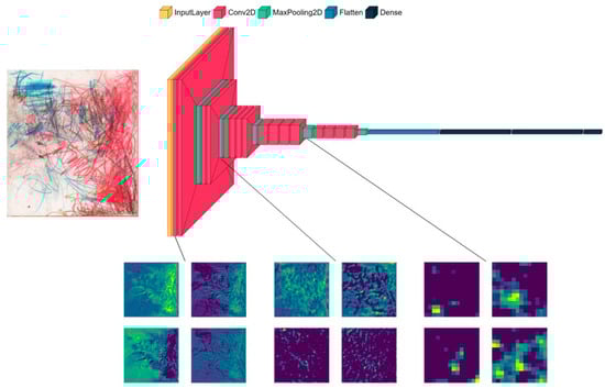 As features pre-selected by humans may not grasp all the relevant information in drawings, we focused on deep learning, and more precisely, on CNN. The first CNN was trained on Molly’s drawings to predict the season. We used the transfer learning method [16] to circumvent the limitations of our relatively small dataset. Transfer learning consists of using an existing model that has already been trained on a particular task to perform another task. Following previous studies on drawings [17,18], we used the VGG19 architecture with ImageNet weights. VGG19 consists of 16 convolutional layers followed by 3 fully connected (FC) layers. We transferred the weights of the convolutional layers and randomly initialized the weights of the FC layers. The number of channels starts from 64 in the early layers, which captures simple elements such as lines, curves, and blobs [19], and grows to 512 in the deepest convolutional layers, allowing the network to learn a representation of complex objects. All convolution kernels were 3 × 3. We tested different parameters and hyperparameters (e.g., learning rate and length of FC layers) to find the best model, the architecture of which is described as follows. The last convolutional layer from VGG19 is followed by an average pooling layer and a batch normalization layer. Then, a first FC layer of size 2048 with L2 regularization (strength of regularization of 0.1) is added, as well as a dropout layer with a rate of 0.2. The last layer is an FC layer of size 4, and each neuron corresponds to a season with softmax activation. We use a categorical cross-entropy loss function. To train the model, we used a stochastic gradient descent (SGD) optimizer with a learning rate of 0.1, and a batch size of 16. The best model was determined through early stopping by monitoring the validation set accuracy, and the training was stopped after three epochs with no improvement. As VGG19 is not specifically trained on drawings or paintings, we froze all convolutional blocks. To increase model accuracy, we also used data augmentation (horizontal and vertical flips). Illustration of the VGG19 architecture and examples of feature maps are shown in Figure 2.