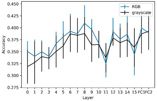 Mean accuracy of the 10-fold cross-validation for RGB images and grayscale images for each layer. The integer values on the x axis represent the convolutional layer on which the accuracy has been calculated, while FC1 and FC2, respectively, represent the first and second fully connected layers. The vertical bars represent the standard deviations.