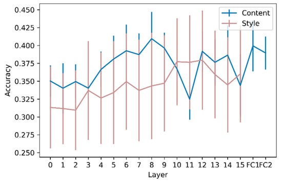 The results of the Gram matrix-based classifications computed on RGB images are shown in Figure 5. Classification accuracy increased with layer depth (p < 0.001), indicating that complex-style features vary across seasons.