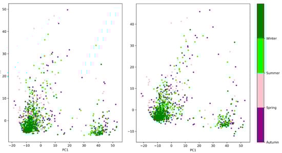 The PCA applied to the Gram matrices showed that 80% of the variation could be retained with only two principal components for the first two convolutional layers. The corresponding scatter plots of PC1 versus PC2 revealed two possible clusters that did not appear to be season-dependent (Figure 6). With current data, it is difficult to identify the factors that explain these two clusters. They may be linked to the identity of the keeper or to various events that occurred at the Tama Zoological Park [4]. However, the corresponding scatter plots obtained from the activation vector (i.e., for content-based classification) also exhibited two clusters. These clusters become less distinct and less marked when looking at deeper layers and completely vanish in the deepest layers, suggesting that they are primarily rooted in low-level features such as edges (orientation and width).