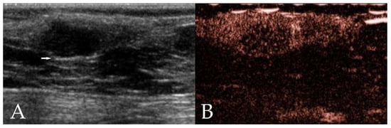 Ultrasonographic images of a mammary adenoma in a 12 year old intact Border Collie. (A) On B-mode ultrasonography, the neoplasm shows an ovoid shape, well-defined border, hypoechoic homogeneous echotexture, and the presence of edge enhancement (arrow). (B) Contrast-enhanced ultrasonography (CEUS) shows heterogeneous enhancement.