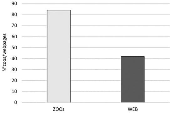 The number of zoos involved in lemur conservation projects was 84, whereas the number of webpages dedicated to such projects on the zoos’ websites was 42 (Figure 1) less than the zoos involved. The difference between the zoos involved in a project and the webpages of the zoo dedicated to the conservation project was significant (V = 45; p = 0.008) (Figure 2). However, we found significant correlation between the number of zoos involved in conservation projects and the number of webpages (Rho = 0.639; p = 0.029).