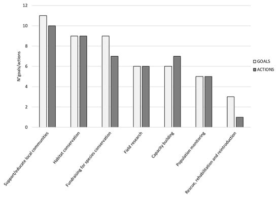 Figure 3 reports the number of times different actions characterizing lemur conservation projects were set as goals and the number of times they were effectively achieved. Most of the projects had the following goals: “support/educate the local communities” and “habitat conservation”. We found a strongly significant positive correlation between goals and achievements (Rho = 0.954; p = 0.007).