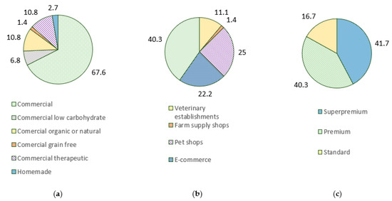 Percentage (%) of reported diet choices regarding type of diet (a), place of purchase (b), and diet quality (c) used by Portuguese owners responding the survey.