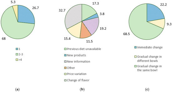 Feeding habits of Portuguese owners responding the survey regarding the number of daily feedings (a), reasons behind diet changes (b), and the way that diet change is conducted (c).