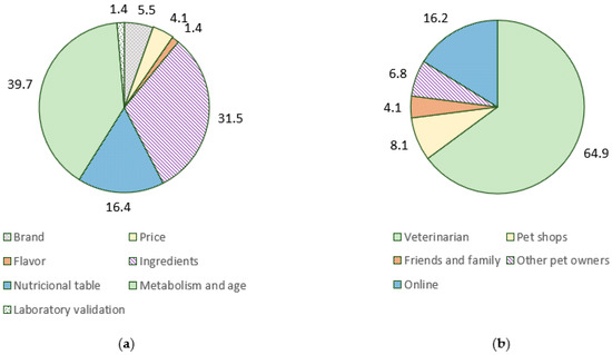 Major factors involved in the choice of pet food (a) and sources of information for this choice (b).