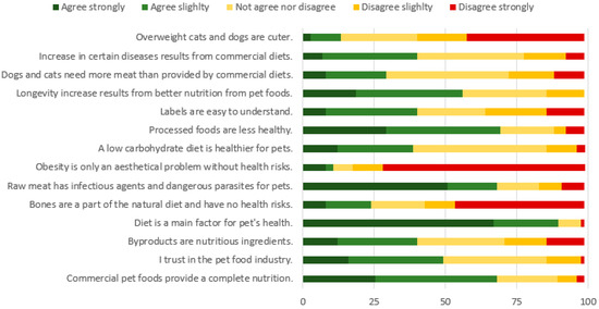 Regarding commercial diets, most owners agree that pet foods provide complete nutrition (68.0%), that they trust the pet food industry (49.3%), and that increased pet longevity is a result of proper nutrition provided by pet foods (56.1%) (Figure 4). However, an important percentage (40.0%) believes that commercial diets are related to the increase in certain diseases, such as cancer or chronic diseases. Indeed, 89.4% of pet owners agree that diet is a major factor in their pet’s health. While the majority of owners understand the labels in pet food easily (40.0%), a considerate amount still finds it somewhat difficult (34.6%). Most respondents disagree that they find overweight pets cuter (58.6%) and that pet obesity is a purely aesthetical problem (81.4%), which reveals a high sensibility to this topic. Regarding alternative diets, most pet owners agree that by-products are nutritious (40.0%), that raw meat contains dangerous pathogens and parasites (68.0%), and that ingestion of animal bones has health risks (56.0%). Opinions are divided regarding the need for more meat in commercial diets, with 29.3% of owners agreeing with this need, 26.7% disagreeing, and most not having an opinion (42.7%). Regarding low carbohydrate diets, many agree that this is a healthier choice (38.7%), with most do not having a strong opinion on the topic (46.7%). Despite the support for commercial pet foods, as previously mentioned, pet owners strongly believe that processed foods are less healthy (59.3%). All tests between diet types are non-significant apart from “Overweight cats and dogs are cuter” (H2: 6.328; p = 0.042), for which owners feeding therapeutically diets strongly disagree when compared to other diet types. Averages and medians for each question are presented in Table A4, Appendix B.