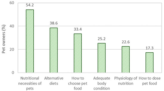 Pet owners were asked to select the topics on pet nutrition and feeding that they felt more interested in learning (Figure 5). Most pet owners wanted to learn more about the nutritional necessities of pets (54.2%), followed immediately by alternative diets (38.6%) and how to choose pet food (33.4%).