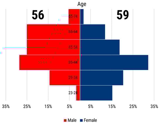 Population pyramid of participants, with 56 males (red) and 59 females (blue) grouped in six age ranges.